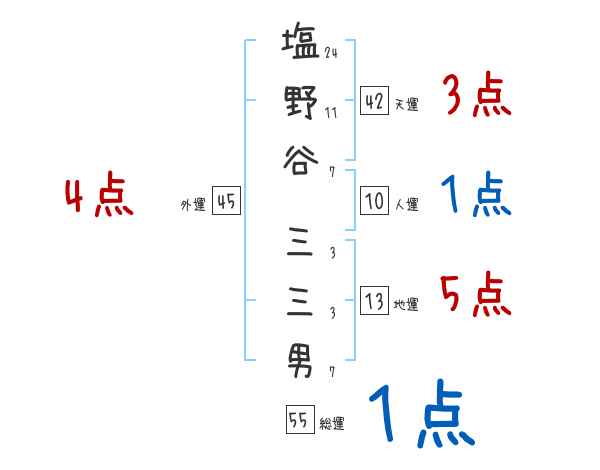 総運![]() | 塩野谷三三男さんの総運は55画の1つ星!欲張りな性格で軽率な行動に注意しましょう。病気に気をつけて。 あなたの人生を表す1番重要な運勢です。生涯を通じて影響する総合運となり、主に50歳以降の晩年期に影響を及ぼします。 |
