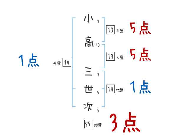天運![]() | 小高三世次さんの天運は13画の5つ星!才能に恵まれ人気がある。名声を手に入れる。円満な人生。 家系が持つ宿命的な運勢を表します。祖先から受け継いだ苗字ですので自分の力が及びません。家柄を象徴します。 |