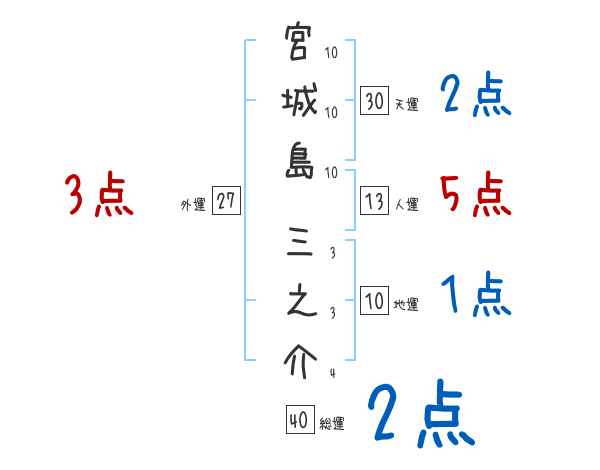 天運![]() | 宮城島三之介さんの天運は30画の2つ星!浮き沈みの激しさに注意しましょう。 家系が持つ宿命的な運勢を表します。祖先から受け継いだ苗字ですので自分の力が及びません。家柄を象徴します。 |