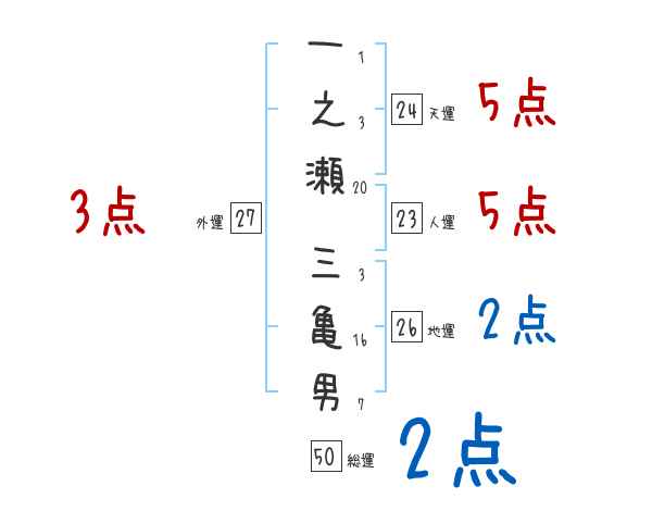 総運![]() | 一之瀬三亀男さんの総運は50画の2つ星!浮き沈みが激しく不安定。しりすぼみに衰退しやすいので注意しましょう。 あなたの人生を表す1番重要な運勢です。生涯を通じて影響する総合運となり、主に50歳以降の晩年期に影響を及ぼします。 |