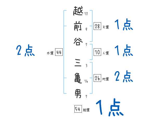 総運![]() | 越前谷三亀男さんの総運は54画の1つ星!トラブルが多いかも。周りをよく見て協調して過ごしましょう。 あなたの人生を表す1番重要な運勢です。生涯を通じて影響する総合運となり、主に50歳以降の晩年期に影響を及ぼします。 |