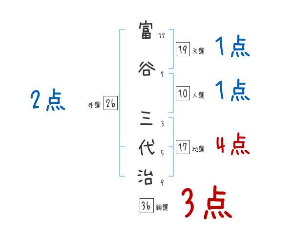総運![]() | 富谷三代治さんの総運は36画の3つ星!先見性が豊かです。多少神経質で苦労することも。 あなたの人生を表す1番重要な運勢です。生涯を通じて影響する総合運となり、主に50歳以降の晩年期に影響を及ぼします。 |