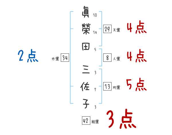 天運![]() | 眞榮田三佐子さんの天運は29画の4つ星!完全主義で才能がある。厳格な心の持ち主。 家系が持つ宿命的な運勢を表します。祖先から受け継いだ苗字ですので自分の力が及びません。家柄を象徴します。 |
