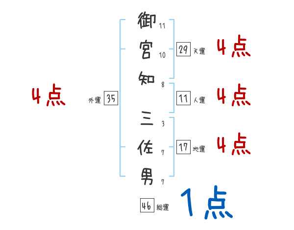 外運![]() | 御宮知三佐男さんの外運は35画の4つ星!温厚な性格で感受性が高い。穏和な性格で人望が厚い。 生活面を象徴する運勢です。外部から受ける影響力を表し、結婚運、家庭運や職場、環境への順応性を表します。 |