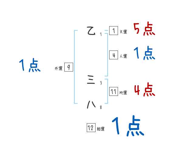 天運![]() | 乙三八さんの天運は1画の5つ星!行動力、指導力があり出世し繁栄する。幸運に恵まれる。 家系が持つ宿命的な運勢を表します。祖先から受け継いだ苗字ですので自分の力が及びません。家柄を象徴します。 |
