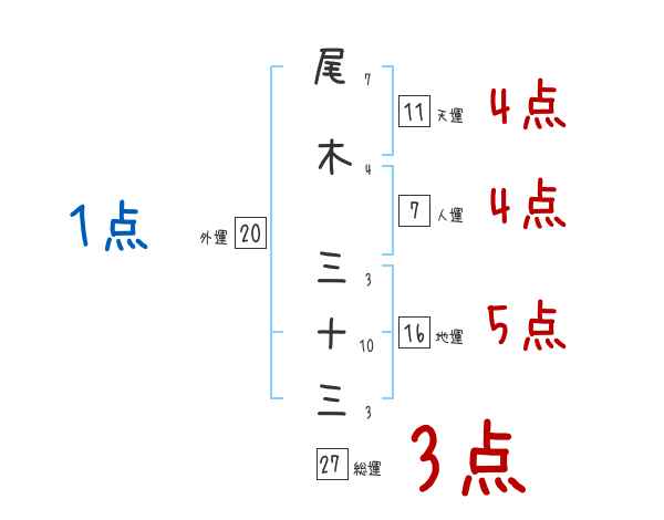 天運![]() | 尾木三十三さんの天運は11画の4つ星!着実に富や地位を得る幸運な人生。 家系が持つ宿命的な運勢を表します。祖先から受け継いだ苗字ですので自分の力が及びません。家柄を象徴します。 |