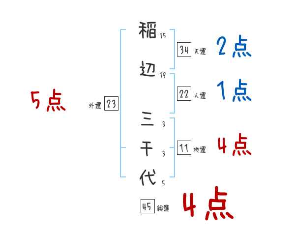 外運![]() | 稲辺三千代さんの外運は23画の5つ星!想像力に優れ活力がある。一代で成功し名誉を手に入れる。 生活面を象徴する運勢です。外部から受ける影響力を表し、結婚運、家庭運や職場、環境への順応性を表します。 |