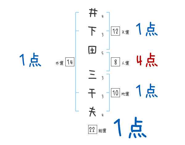 総運![]() | 井下田三千夫さんの総運は22画の1つ星!努力することが苦手ないっぽう手先が器用。芸術性にも優れる。 あなたの人生を表す1番重要な運勢です。生涯を通じて影響する総合運となり、主に50歳以降の晩年期に影響を及ぼします。 |