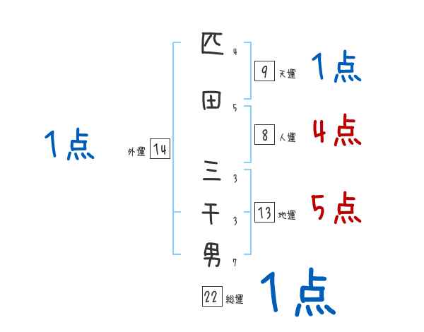 総運![]() | 匹田三千男さんの総運は22画の1つ星!努力することが苦手ないっぽう手先が器用。芸術性にも優れる。 あなたの人生を表す1番重要な運勢です。生涯を通じて影響する総合運となり、主に50歳以降の晩年期に影響を及ぼします。 |