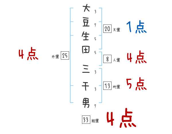 総運![]() | 大豆生田三千男さんの総運は33画の4つ星!権力志向でプライドが高い。勇気があり運を切り開き成功する。 あなたの人生を表す1番重要な運勢です。生涯を通じて影響する総合運となり、主に50歳以降の晩年期に影響を及ぼします。 |