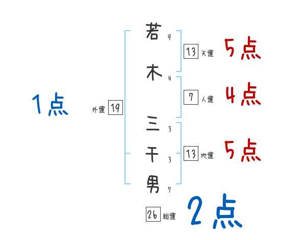 総運![]() | 若木三千男さんの総運は26画の2つ星!波瀾万丈かも。信頼できる人を大事にしましょう。 あなたの人生を表す1番重要な運勢です。生涯を通じて影響する総合運となり、主に50歳以降の晩年期に影響を及ぼします。 |