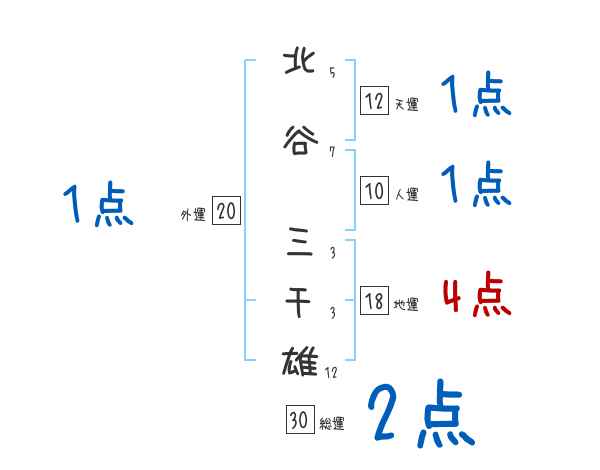 天運![]() | 北谷三千雄さんの天運は12画の1つ星!簡単な失敗で諦めてしまいやすいかも。着実に行動すると良いでしょう。 家系が持つ宿命的な運勢を表します。祖先から受け継いだ苗字ですので自分の力が及びません。家柄を象徴します。 |