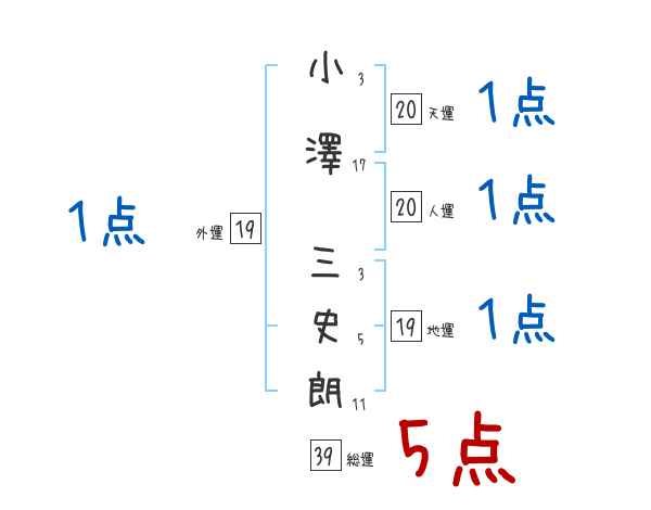外運![]() | 小澤三史朗さんの外運は19画の1つ星!優れた才能を持ちますが、協調性が足りないことも。周りの人と協力する事を意識しましょう。 生活面を象徴する運勢です。外部から受ける影響力を表し、結婚運、家庭運や職場、環境への順応性を表します。 |