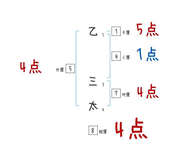 天運![]() | 乙三太さんの天運は1画の5つ星!行動力、指導力があり出世し繁栄する。幸運に恵まれる。 家系が持つ宿命的な運勢を表します。祖先から受け継いだ苗字ですので自分の力が及びません。家柄を象徴します。 |