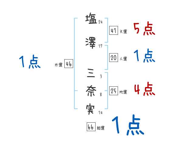 天運![]() | 塩澤三奈実さんの天運は41画の5つ星!大志を抱き、目標に向かって実力を発揮し達成する。温和な性格。 家系が持つ宿命的な運勢を表します。祖先から受け継いだ苗字ですので自分の力が及びません。家柄を象徴します。 |