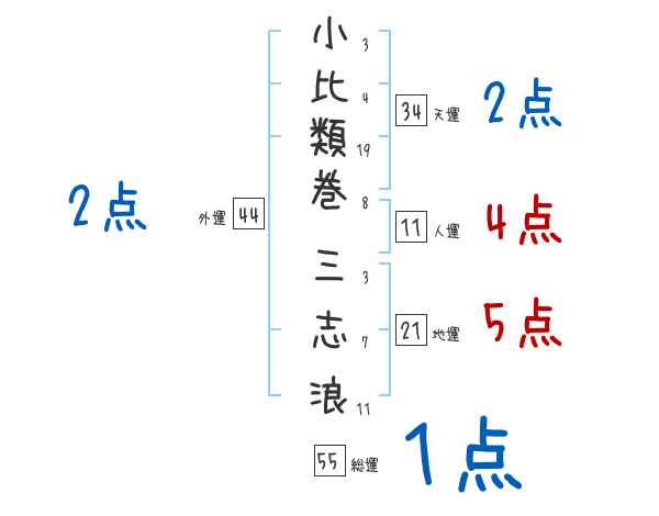 外運![]() | 小比類巻三志浪さんの外運は44画の2つ星!誠実で慎重な性格。物事を考えすぎないように注意しましょう。 生活面を象徴する運勢です。外部から受ける影響力を表し、結婚運、家庭運や職場、環境への順応性を表します。 |