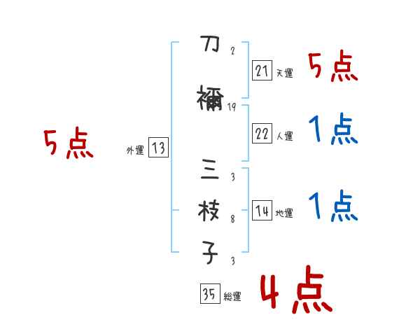 天運![]() | 刀禰三枝子さんの天運は21画の5つ星!統率力がある。独立し成功する。名誉を手に入れる。 家系が持つ宿命的な運勢を表します。祖先から受け継いだ苗字ですので自分の力が及びません。家柄を象徴します。 |