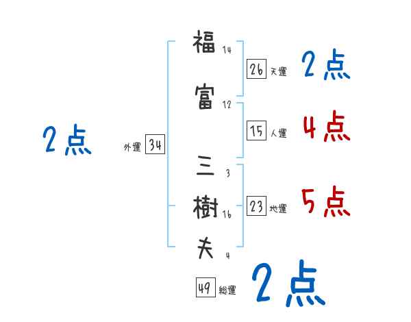 天運![]() | 福富三樹夫さんの天運は26画の2つ星!波瀾万丈かも。信頼できる人を大事にしましょう。 家系が持つ宿命的な運勢を表します。祖先から受け継いだ苗字ですので自分の力が及びません。家柄を象徴します。 |