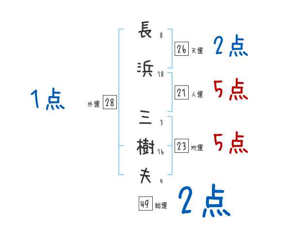 | 人運  | 長浜三樹夫さんの人運は21画の5つ星!統率力がある。独立し成功する。名誉を手に入れる。性格や才能などを表す2番目に重要な運勢です。人間関係や協調性、社会的な成功に影響します。主に20歳から50歳ぐらいまでの中年期の運勢を表します。 |