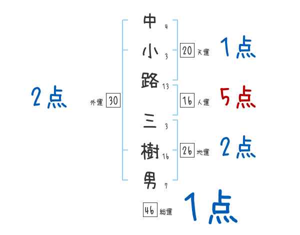 人運![]() | 中小路三樹男さんの人運は16画の5つ星!人望が厚く大きく発展する。逆転成功が見える。 性格や才能などを表す2番目に重要な運勢です。人間関係や協調性、社会的な成功に影響します。主に20歳から50歳ぐらいまでの中年期の運勢を表します。 |