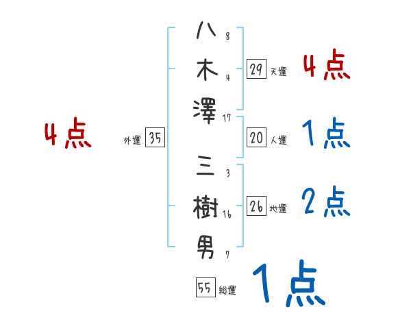 外運![]() | 八木澤三樹男さんの外運は35画の4つ星!温厚な性格で感受性が高い。穏和な性格で人望が厚い。 生活面を象徴する運勢です。外部から受ける影響力を表し、結婚運、家庭運や職場、環境への順応性を表します。 |