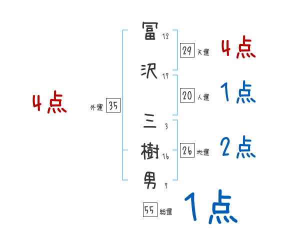 外運![]() | 冨沢三樹男さんの外運は35画の4つ星!温厚な性格で感受性が高い。穏和な性格で人望が厚い。 生活面を象徴する運勢です。外部から受ける影響力を表し、結婚運、家庭運や職場、環境への順応性を表します。 |