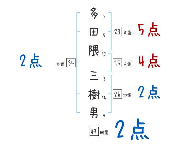 天運![]() | 多田隈三樹男さんの天運は23画の5つ星!想像力に優れ活力がある。一代で成功し名誉を手に入れる。 家系が持つ宿命的な運勢を表します。祖先から受け継いだ苗字ですので自分の力が及びません。家柄を象徴します。 |