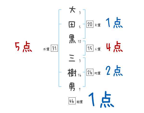 外運![]() | 大田黒三樹男さんの外運は31画の5つ星!社交性があり判断力に優れる。順風満帆な人生で円満な生活。 生活面を象徴する運勢です。外部から受ける影響力を表し、結婚運、家庭運や職場、環境への順応性を表します。 |