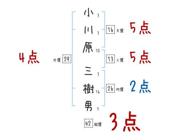 総運![]() | 小川原三樹男さんの総運は42画の3つ星!病気に注意。多芸であるが消極的でおとなしい。 あなたの人生を表す1番重要な運勢です。生涯を通じて影響する総合運となり、主に50歳以降の晩年期に影響を及ぼします。 |