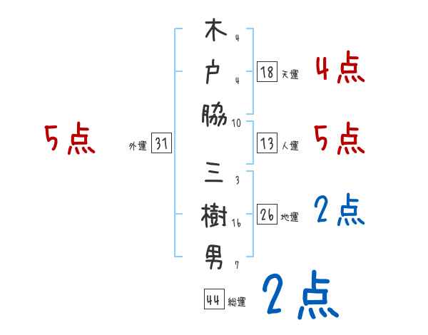 外運![]() | 木戸脇三樹男さんの外運は31画の5つ星!社交性があり判断力に優れる。順風満帆な人生で円満な生活。 生活面を象徴する運勢です。外部から受ける影響力を表し、結婚運、家庭運や職場、環境への順応性を表します。 |
