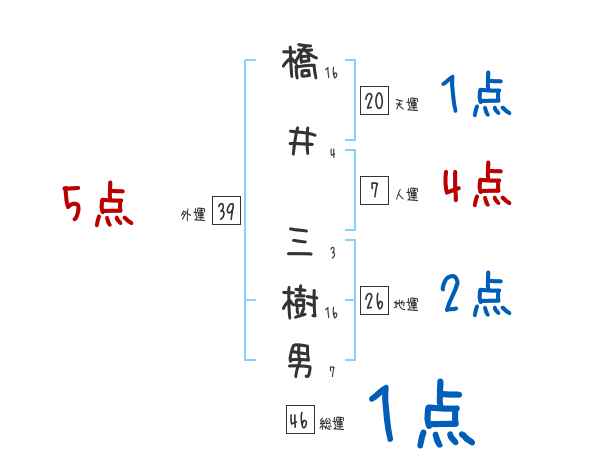 外運![]() | 橋井三樹男さんの外運は39画の5つ星!社交性に優れ人望が厚い。人の上に立ち成功する。 生活面を象徴する運勢です。外部から受ける影響力を表し、結婚運、家庭運や職場、環境への順応性を表します。 |