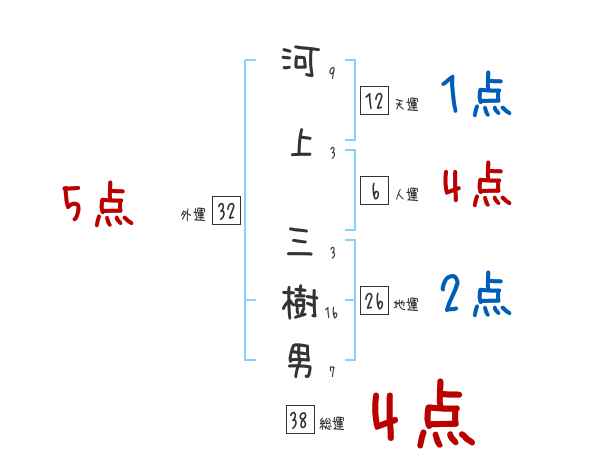 外運![]() | 河上三樹男さんの外運は32画の5つ星!柔軟性があり成功する。チャンスが多く金運が良い。 生活面を象徴する運勢です。外部から受ける影響力を表し、結婚運、家庭運や職場、環境への順応性を表します。 |