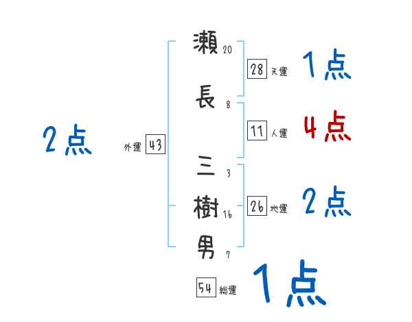 天運![]() | 瀬長三樹男さんの天運は28画の1つ星!家庭環境に注意。スポーツで活躍できる能力があるかも。 家系が持つ宿命的な運勢を表します。祖先から受け継いだ苗字ですので自分の力が及びません。家柄を象徴します。 |