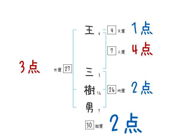 天運![]() | 王三樹男さんの天運は4画の1つ星!感情が不安定で苦労するかも。周囲との協調を心掛けましょう。 家系が持つ宿命的な運勢を表します。祖先から受け継いだ苗字ですので自分の力が及びません。家柄を象徴します。 |