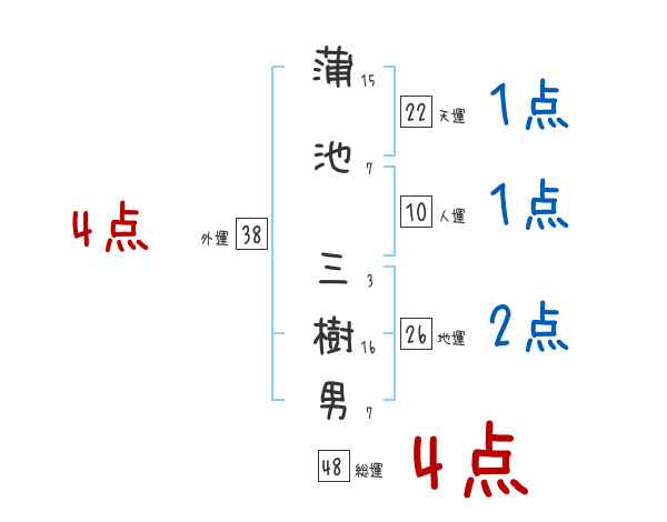 天運![]() | 蒲池三樹男さんの天運は22画の1つ星!努力することが苦手ないっぽう手先が器用。芸術性にも優れる。 家系が持つ宿命的な運勢を表します。祖先から受け継いだ苗字ですので自分の力が及びません。家柄を象徴します。 |