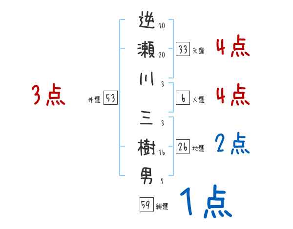 総運![]() | 逆瀬川三樹男さんの総運は59画の1つ星!意志の弱さであきらめることが多いかも。粘り強さが必要。 あなたの人生を表す1番重要な運勢です。生涯を通じて影響する総合運となり、主に50歳以降の晩年期に影響を及ぼします。 |