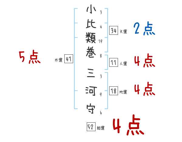 天運![]() | 小比類巻三河守さんの天運は34画の2つ星!独創性に優れるが、自尊心が強く災難に注意しましょう。 家系が持つ宿命的な運勢を表します。祖先から受け継いだ苗字ですので自分の力が及びません。家柄を象徴します。 |
