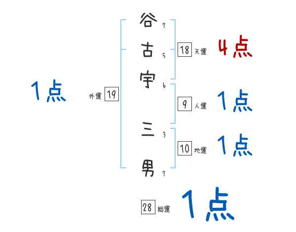谷古宇三男さんの画数の鑑定結果