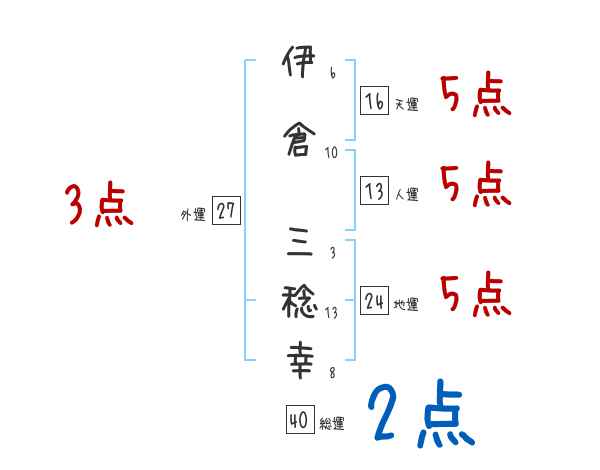 天運![]() | 伊倉三稔幸さんの天運は16画の5つ星!人望が厚く大きく発展する。逆転成功が見える。 家系が持つ宿命的な運勢を表します。祖先から受け継いだ苗字ですので自分の力が及びません。家柄を象徴します。 |