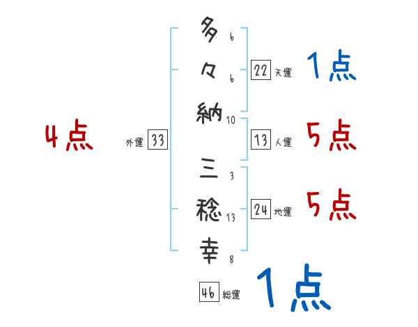 総運![]() | 多々納三稔幸さんの総運は46画の1つ星!迷走することが多く苦労するかも。目先のことにとらわれないように。 あなたの人生を表す1番重要な運勢です。生涯を通じて影響する総合運となり、主に50歳以降の晩年期に影響を及ぼします。 |