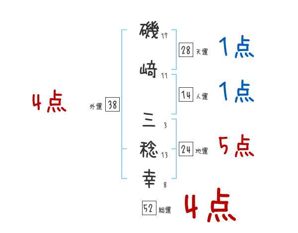 外運![]() | 磯﨑三稔幸さんの外運は38画の4つ星!温厚な性格で技術的な才能を発揮する。職人的な仕事に向いている。 生活面を象徴する運勢です。外部から受ける影響力を表し、結婚運、家庭運や職場、環境への順応性を表します。 |