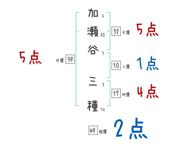 天運![]() | 加瀬谷三種さんの天運は32画の5つ星!柔軟性があり成功する。チャンスが多く金運が良い。 家系が持つ宿命的な運勢を表します。祖先から受け継いだ苗字ですので自分の力が及びません。家柄を象徴します。 |