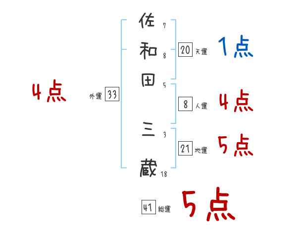 総運![]() | 佐和田三蔵さんの総運は41画の5つ星!大志を抱き、目標に向かって実力を発揮し達成する。温和な性格。 あなたの人生を表す1番重要な運勢です。生涯を通じて影響する総合運となり、主に50歳以降の晩年期に影響を及ぼします。 |