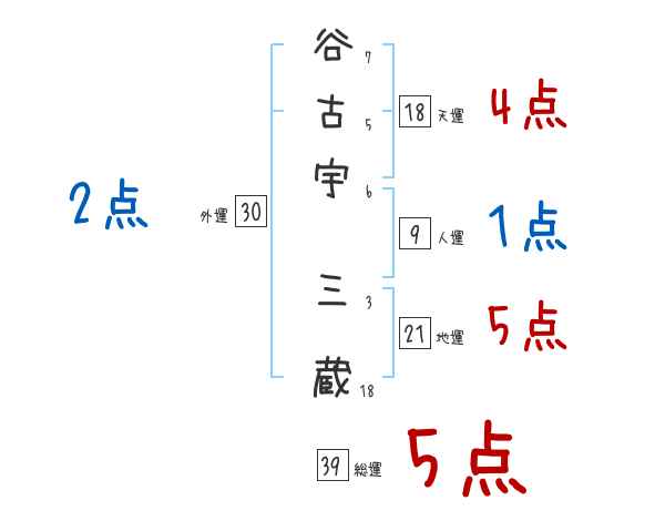 総運![]() | 谷古宇三蔵さんの総運は39画の5つ星!社交性に優れ人望が厚い。人の上に立ち成功する。 あなたの人生を表す1番重要な運勢です。生涯を通じて影響する総合運となり、主に50歳以降の晩年期に影響を及ぼします。 |