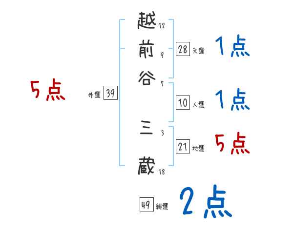 天運![]() | 越前谷三蔵さんの天運は28画の1つ星!家庭環境に注意。スポーツで活躍できる能力があるかも。 家系が持つ宿命的な運勢を表します。祖先から受け継いだ苗字ですので自分の力が及びません。家柄を象徴します。 |