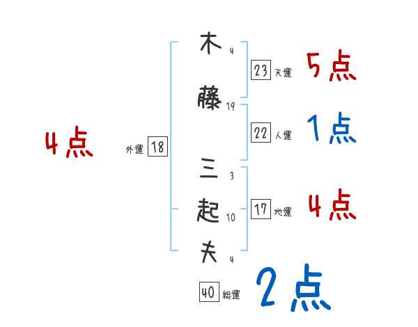 天運![]() | 木藤三起夫さんの天運は23画の5つ星!想像力に優れ活力がある。一代で成功し名誉を手に入れる。 家系が持つ宿命的な運勢を表します。祖先から受け継いだ苗字ですので自分の力が及びません。家柄を象徴します。 |