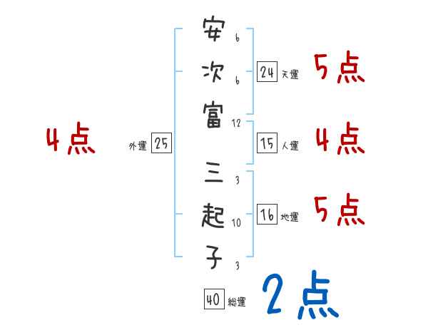 天運![]() | 安次富三起子さんの天運は24画の5つ星!家庭運が良く順調な人生。金運にも恵まれる。 家系が持つ宿命的な運勢を表します。祖先から受け継いだ苗字ですので自分の力が及びません。家柄を象徴します。 |
