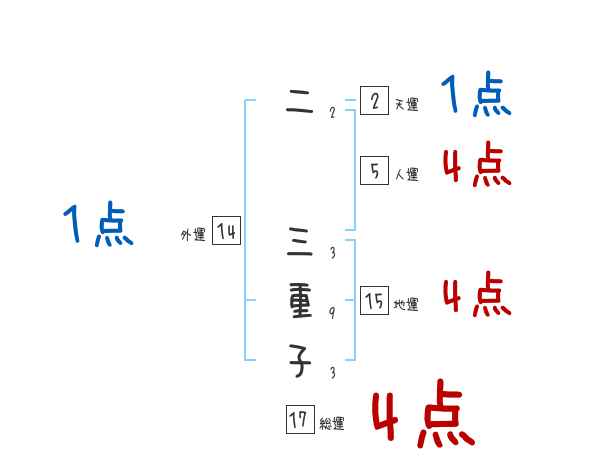 外運![]() | 二三重子さんの外運は14画の1つ星!人に対して優しいがストレスを溜め込みがち。人間関係のトラブルを避けるよう気をつけましょう。 生活面を象徴する運勢です。外部から受ける影響力を表し、結婚運、家庭運や職場、環境への順応性を表します。 |