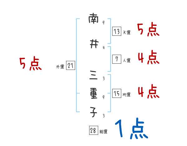 天運![]() | 南井三重子さんの天運は13画の5つ星!才能に恵まれ人気がある。名声を手に入れる。円満な人生。 家系が持つ宿命的な運勢を表します。祖先から受け継いだ苗字ですので自分の力が及びません。家柄を象徴します。 |