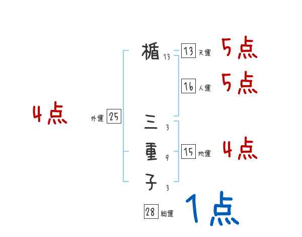 人運![]() | 楯三重子さんの人運は16画の5つ星!人望が厚く大きく発展する。逆転成功が見える。 性格や才能などを表す2番目に重要な運勢です。人間関係や協調性、社会的な成功に影響します。主に20歳から50歳ぐらいまでの中年期の運勢を表します。 |